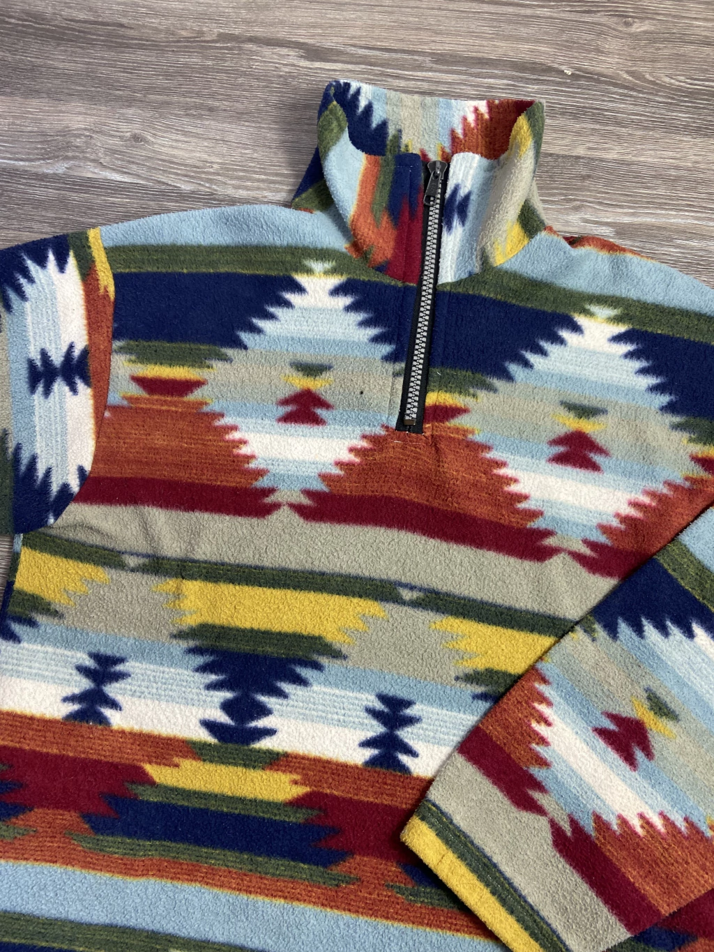 Tecido em poliéster, gola com ajuste em zíper e bolsos laterais.
