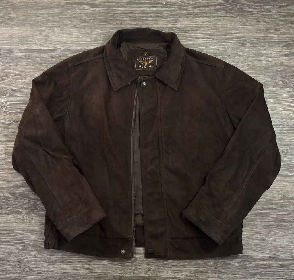 Jaqueta premium confeccionada em couro legítimo, cor marrom, com fechamento em zíper e botões de pressão. Possui bolsos laterais, forro interno com design especial e acabamento refinado. Peça resistente e sofisticada, em ótimo estado.